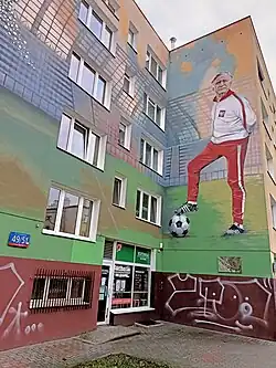 - ↑ Na bloku, w którym mieszkał Kazimierz Górski, odsłonięto mural z jego wizerunkiem. PZPN – Łączy nas piłka, 9 listopada 2021. [dostęp 2024-07-10].