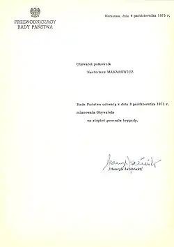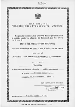 - pułkownik – 1 października 1960 z dniem 12 października 1960 w korpusie osobowym oficerów wojsk pancernych, w grupie dowódczo-sztabowej