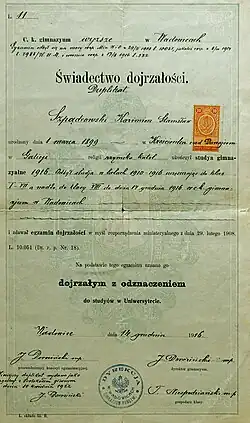 - Świadectwo dojrzałości z Gimnazjum w Wadowicach z dnia 14 grudnia 1916 r.