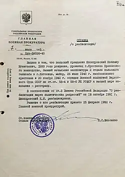 - ↑ Pismo z Generalnej Prokuratury Federacji Rosyjskiej do Andrzeja Szpądrowskiego, syna mjr dypl Kazimierza Szpądrowskiego, Główna Prokuratura Wojskowa w Moskwie z dnia 19 grudnia 1995 nr 5 UW-1414/95, podpisanym przez St. Prokuratora J.W. Panasjugina.