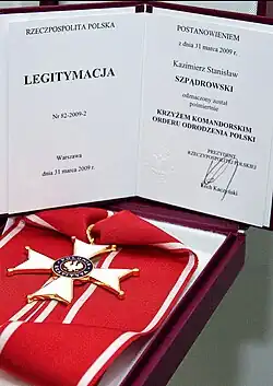 - Krzyż Komandorski Orderu Odrodzenia (pośm. 31 marca 2009 roku) – postanowieniem Prezydenta Rzeczypospolitej Polskiej Lecha Kaczyńskiego, za „wybitne zasługi dla niepodległości Rzeczypospolitej Polskiej”[28]. Uroczystość wręczenia tego odznaczenia rodzinie mjr dypl. Szpądrowskiego odbyła się 23 października 2009 roku w Belwederze. Medal wręczał Andrzej Duda, ówczesny podsekretarz stanu w Kancelarii Prezydenta.
