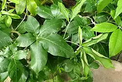 - Skrętoległe, zrzucane w porze suchej, ale też należą tu rośliny wiecznie zielone naprzeciwległe. Blaszka liściowa dłoniasto złożona, zwykle z 3–5 listkami (rzadko z pojedynczym listkiem lub większą ich liczbą – do 8)[7][6].