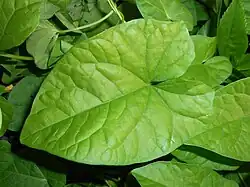 - Skrętoległe i pojedyncze, bez przylistków[18]. Blaszka duża – do 8 cm długa i 5 cm szeroka[11], ogonki do 6 cm długości[11]. Blaszka podłużnie trójkątna z głęboką, V-kształtną nasadą[19], całobrzega[8], czasem tylko na klapach przynasadowych występuje jeden lub dwa ząbki[11]. Na końcach blaszka jest zwykle długo wyciągnięta, rzadziej tępa, niemal zawsze jednak z drobnym, ostrym kończykiem[11].