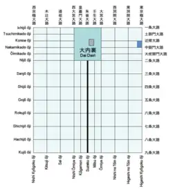 Oś Pałacu wyznaczała ulica, szeroka na 85 m Suzaku-ōji[3], rozpoczynająca się od bramy Suzaku-mon Wielkiego Pałacu, a zamknięta od południa bramą Rashō-mon (przy Kujō-ōji). Dzisiaj śladem tej ulicy biegnie Sen-bon-dōri. Pozostałością dawnego układu jest świątynia Tō-ji, czyli „wschodnia”, choć leży ona na zachód od dzisiejszej głównej osi miasta. Miasto pełne było świątyń buddyjskich i chramów shintō, pałaców i rezydencji otoczonych ogrodami. W XII w. Kioto liczyło prawie pół miliona mieszkańców.