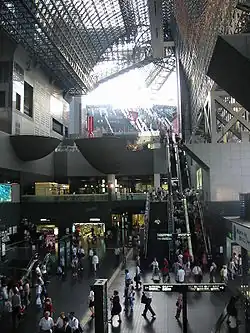 Połączenia wewnętrzne. Mimo że miasto nie ma rozbudowanego systemu dróg szybkiego ruchu, struktura modalna ewoluowała w latach 80. w kierunku coraz większego udziału samochodu. W 1990 roku 26,5% podróży odbywało się samochodem, a 21,6% transportem publicznym (z tego 14,7% SKM – najniższy udział w miastach Keihanshin, a 6,9% autobusem)[18]. W 2010 roku 24,3% podróży odbywało się samochodem, a 25,1% transportem publicznym. Rower miał największy udział spośród miast Keihanshin – 27,5%, pieszo przemieszczało się 22,9% osób[19]. Sieć SKM składa się z wymienionych linii kolei prywatnych oraz dwóch linii metra miejskiego: Karasuma-sen (przebieg południkowy) i Tōzai-sen (przebieg równoleżnikowy). Pierwsza linia prowadzi również pociągi Kintetsu do Nary, druga pociągi Keihan Keishin-sen. Ponadto w Kioto funkcjonuje rozbudowany system autobusów miejskich. Osobliwością są dwie zachowane kolejki „lekkie”, Eizan Dentetsu – prowadząca na północ skrajem wzgórz do kompleksu świątyń na Kurama-yama (przy jej stacjach końcowych funkcjonują dwa funikulary) oraz Keifuku, przypomnienie kiotańskiej sieci tramwajowej, prowadząca do dzielnicy Arashiyama.