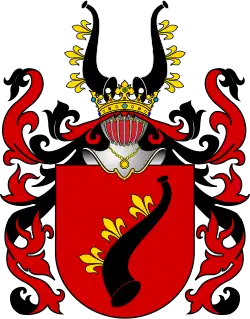 Klejnot: dwie trąby czarne, każda z zaćwieczonymi trzema liliami złotymi.