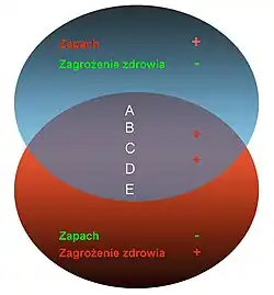 Zasadę klasyfikacji ilustruje schemat, na którym przedstawiono dwa główne zbiory zanieczyszczeń powietrza – zbiór związków szkodliwych dla zdrowia (koło dolne) i zbiór związków wonnych (odoranty; koło górne). W obszarze wspólnym występują związki szkodliwe dla zdrowia, których zapach może odgrywać rolę ostrzegawczego sygnału o chemicznym zagrożeniu. W tej grupie J.H.Amoore i E. Hautala[1] wyodrębnili pięć klas bezpieczeństwa, oznaczonych literami A–E. Zakresy wartości stosunku NDS/cth zestawiono w tabeli z informacją o udziale osób, które wyczuwają zapach zanieczyszczenia przed osiągnięciem NDS.