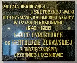 Okres stalinizmu był dla szkoły najtrudniejszy, ale ówczesna dyrektorka Matka Gertruda Żurawska (1945–1967) walczyła o utrzymanie szkoły, prawa państwowe, nabór do szkoły oraz katolickie wychowanie uczennic, choć program szkolny był ściśle nadzorowany przez władze oświatowe[3]. Siostry zapraszały do szkoły na wykłady wybitnych prelegentów (np. Stefana Świeżawskiego[5]).