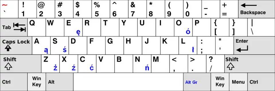 Litery z polskimi znakami diakrytycznymi (ą, ć, ę, ł, ń, ó, ś, ż, ź) uzyskuje się poprzez równoczesne wciśnięcie prawego klawisza Alt (lub AltGr) i łacińskiej litery, z której wywodzi się dodatkowy polski znak, np. „ę” uzyskuje się kombinacją klawiszy Alt i E. Wyjątkiem jest litera „ź”, którą uzyskuje się poprzez wciśnięcie równocześnie klawiszy Alt oraz X.