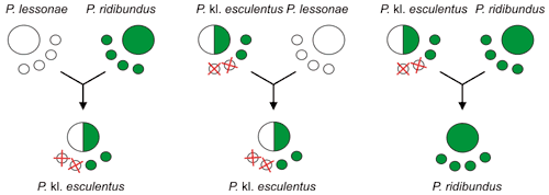- Rana esculenta = Rana ridibunda × Rana lessonae;
