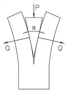 Jeśli klin jest w przekroju trójkątem równoramiennym, to może posłużyć do rozpychania danego materiału, działając na niego siłami . Na trzecią ścianę – zwaną grzbietem klinu – działa siła poruszająca [2], opisana wzorem: