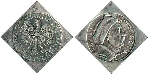 Niezgodnie z przyjętą w latach 1925–1939 zasadą, że monety nieobiegowe (wtedy nazywane próbnymi) musiały być znakowane napisem „PRÓBA”[3], tylko jedna z czterech klip II Rzeczypospolitej, tj. 10 złotych 1933 Jan III Sobieski, została wybita z wypukłym napisem „PRÓBA”[4].
