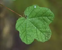 - 3- lub 5-dłoniasto klapowane. Mierzą około 10 cm długości i szerokości. Z wierzchu są gładki, natomiast od spodu są lekko owłosione. Na brzegu jest tępo ząbkowany o tępym lub lekko ostrym wierzchołku. Młode liście mają czerwonobrązową barwę, są błyszczące i omszone od spodu, latem stają się zielone i nadal są błyszczące, natomiast jesienią przebarwiają się na żółto. Osadzone są na czerwonych ogonkach liściowych[6][8].