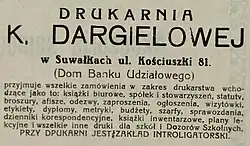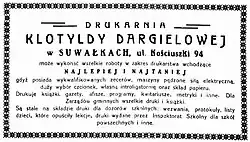 Firma Klotyldy Dargielowej w latach trzydziestych XX wieku była największym zakładem drukarsko-usługowym nie tylko w Suwałkach, ale w całym regionie północno-wschodnim. Nie miała tylko chemigrafii. Klisze wykonywano w Chemigrafii Polskiej w Warszawie lub w Cynkografii F. Zaniewskiego w Wilnie[4]. Drukowano tu nie tylko wydawnictwa zwarte, ale również gazety i czasopisma, afisze, ogłoszenia, broszury, statuty stowarzyszeń i organizacji, obwieszczenia urzędowe, druki księgowe itp.