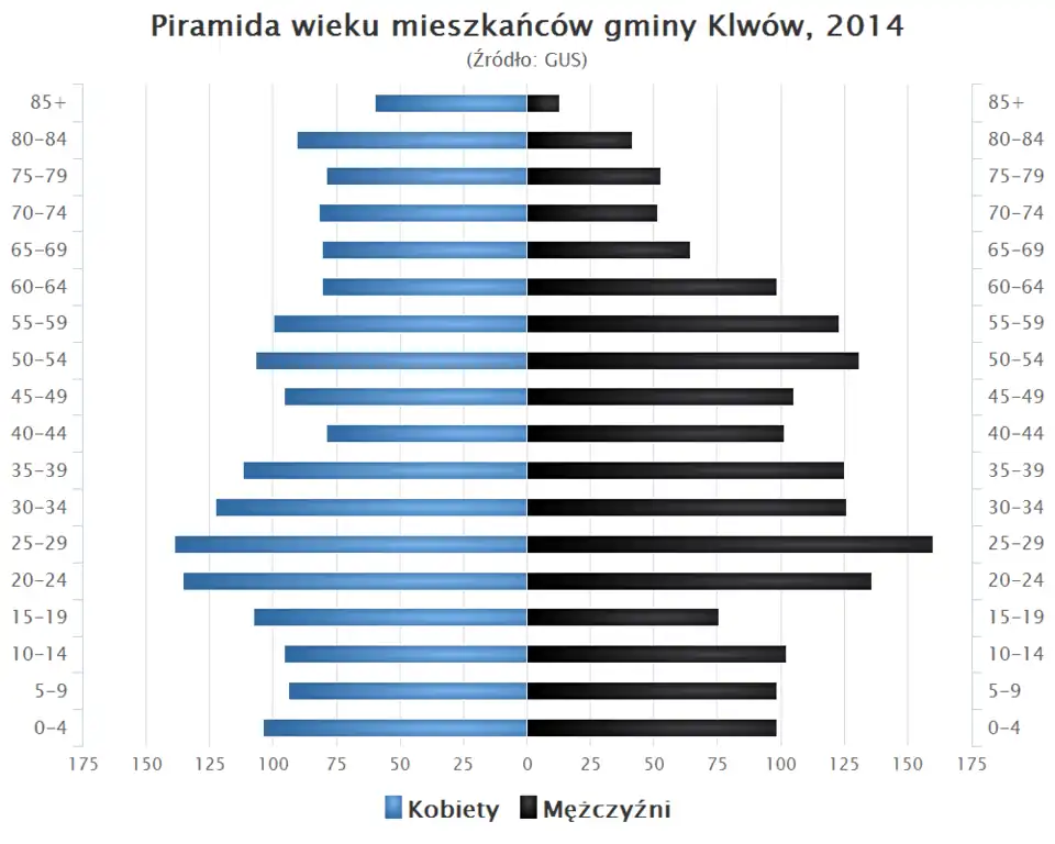 - Piramida wieku mieszkańców gminy Klwów w 2014 roku[1].