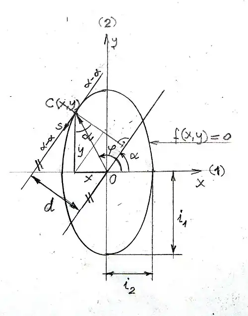 Wprowadźmy do rozważań nową wielkość – tzw. promień bezwładności liczony prostopadle do osi od środka elipsy do jej stycznej poprowadzonej w punkcie (rys.4). Jest on określony wzorem