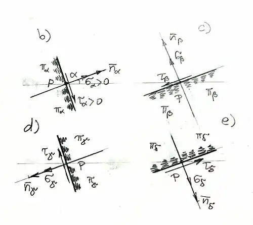 Rysunki 2b-e ilustrują stany naprężeń występujące w punkcie półpłaszczyzn o wersorach