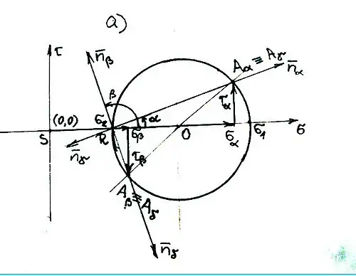 Koło budujemy w układzie współrzędnych [2]. Jego środek ma w tym układzie współrzędne promień zaś ma długość (rys.2a). Na tym rysunku kierunek wersora określa prosta wyznaczona przez punkty przy czym współrzędne punktu określają naprężenia działające na punkt półpłaszczyzny (rys. 2b). Po obrocie wersora o kąt przyjmuje on pozycję W tym przypadku punkt ma współrzędne określające stan naprężenia w punkcie półpłaszczyzny (rys.2c).