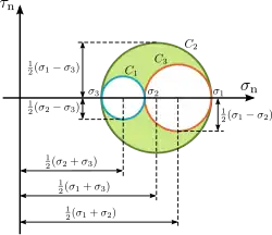 Rys. 1 – koło Mohra dla przestrzennego stanu naprężenia. Punkt reprezentujący naprężenia normalne i styczne działające w przekroju dowolnie zorientowanym leży w zielonym obszarze.