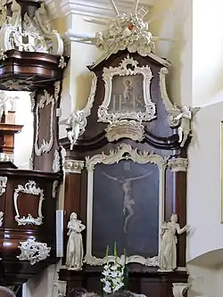 Jest to świątynia poreformacka wybudowana w połowie XVII wieku w stylu wczesnobarokowym, którą ufundowali stolnik koronny Wojciech Wesel i ksiądz Szymon Gawłowski, późniejszy kanonik płocki w 1648 roku. Kamień węgielny pod budowę kościoła i klasztoru został położony przez biskupa Alberta Toliborskiego. Budowa została ukończona w 1650. Obecne wyposażenie wnętrza pochodzi z lat 1714-1777 i zostało wykonane z ciemnego dębu. Pod świątynią oraz kaplicą są umieszczone niedostępne krypty. Kaplica posiada dekorację w stylu wczesnobarokowym, restaurowaną w XIX wieku (zatarto wtedy częściowo jej cechy stylowe)[2].