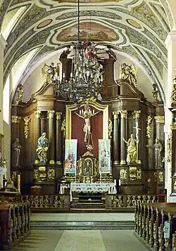 - Ołtarz główny z krucyfiksem z 2 połowy XVII wieku oraz rzeźbami Matki Bożej Bolesnej po lewej stronie, św. Jana Chrzciciela po prawej i dwóch zakonników po obu stronach w narożnikach oraz rzeźbami Boga Ojca, Ducha Świętego i aniołów w zwieńczeniu. Na tabernakulum płaskorzeźba przedstawiająca ukrzyżowanie[3][4].