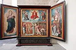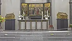 Ołtarz główny zdobi późnogotyckie retabulum w formie tryptyku z malowidłami pędzla kolońskiego anonimowego malarza znanym jako Mistrz Legendy Świętego Jerzego. Środkowa część przedstawia Grupę Ukrzyżowania, skrzydła boczne Przemienienie Pańskie oraz Zmartwychwstanie. Po bokach ołtarza dwa neogotyckie relikwiarze typu domkowego z 1879 zawierające relikwie świętych Kuniberta i Ewalda.