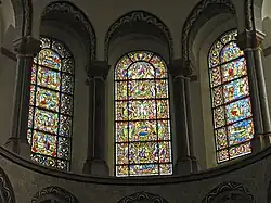 Pomimo pożarów i zniszczeń wojennych kościół zachował liczne dzieła sztuki z XIII–XIX wieku. Wschodnie okna zdobi unikatowy zespół późnoromańskich witraży datowanych na lata 1220–1230. Trzy górne okna absydy zdobią witraże z cyklem kwater przedstawiających Drzewo Jessego, Żywot Św. Kuniberta oraz Żywot Świętego Klemensa, obramionych stylizowaną bordiurą, pozostałe, mniejsze witraże przedstawiają całopostaciowe wizerunki świętych (Cecylii, Korduli, Urszuli, Katarzyny oraz Jana).