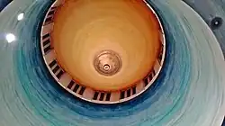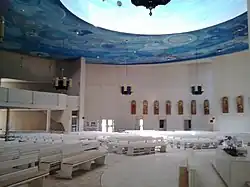 Główna nawa kościoła razem z elementami jej wyposażenia i wystroju: ołtarz, ambona posiadają kształty kuliste. Sklepienie nad nawą główną w całości pokrywa fresk w kolorystyce niebiesko-białej, autorstwa Jacka Korpantego, którego tematyka obrazuje kosmos z bogactwem wirujących ciał niebieskich. Górną część sklepienia wieńczy złocista kula przypominająca Słońce. Pod sklepieniem zawieszono lampy w kształcie rakiet kosmicznych.