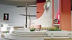 W prezbiterium umieszczono dominujący nad całością krzyż z rzeźbą Jezusa konającego. W prawej części prezbiterium zamontowano tabernakulum w formie srebrnej kuli obracającej się na osi jak Ziemia i inne ciała niebieskie. Za kulistą bryłą głównego ołtarza, wykonanego z różowego marmuru, rozwija się w górę ściana, na której namalowany został techniką leukaustyczną relief przedstawiający Świętą Rodzinę, którego autorem jest również Jacek Korpanty.