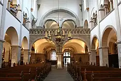 Wschodnią część kościoła tworzy wydzielone trójprzęsłowe, zamknięte poligonalnie (5/8 boków) prezbiterium. Prezbiterium nakryte jest sklepieniem krzyżowo-żebrowym, wsparte na służkach przylegających do częściowo ukrytych w ścianach filarów wiązkowych. Wysmukłe służki i kolumienki są zwieńczone kapitelami z dekoracją roślinną. Kapitele zdobią także filary arkad obramujących okna. Prezbiterium charakteryzuje się diafanicznością, daleko posuniętą redukcją ścian na rzecz okien. Trójprzęsłowy korpus nawowy jest romański. Elewacje nawy głównej podzielone są na trzy strefy: arkad międzynawowych, arkad empor oraz okien. Arkady międzynawowe wsparte są na masywnych, kwadratowych filarach, natomiast na wysokości empor i okien występuje trójpodział. W strefie empor w ślepą arkadę wpisane są potrójne arkady wsparte na filarach z kapitelami kostkowymi. Okna flankują płytkie wnęki. Dawne gotyckie sklepienie krzyżowo-żebrowe nawy głównej zostało po 1945 roku zastąpione prostym stropem. Ściany podzielone są na przęsła za pomocą lizen, powyżej których znajdują się potrójne gotyckie kapitele i służki, także zwieńczone kapitelami. Pomiędzy masywem wieżowym a korpusem nawowym mieści się przęsło chórowe. Chór zakonnic znajduje się na wysokości pierwszej kondygnacji, obejmuje on pomieszczenie w masywie zachodnim oraz emporę, jest zintegrowany za pomocą arkad z emporami ponad nawami bocznymi. Poniżej trójprzęsłowy przedsionek nakryty sklepieniem krzyżowo-kolebkowym wspartym na kolumnach z kapitelami kostkowymi. Na osi parzystych arkad empory bliźniacze filary. Empory i nawy boczne nakryte są sklepieniami krzyżowo-kolebkowymi i gurtami wspartymi na półfilarach z kapitelami kostkowymi, które przylegają do lizen oddzielających poszczególne przęsła. Na zewnątrz prezbiterium opięte jest masywnymi przyporami, pomiędzy nimi mieszczą się okna.