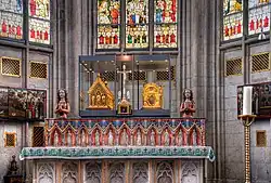 Relikwie były umieszczane nie tylko w przygotowywanych do tego relikwiarzach, ale także zamurowywane, przez co cała świątynia jest swego rodzaju wielkim relikwiarzem kolońskich męczennic. Szczątki świętej Urszuli zostały rozdzielone i pochowane w XIII-wiecznym relikwiarzu ustawionym na gotyckim ołtarzu, barokowym nagrobku tumbowym z 1659 roku, usytuowanym w północnym ramieniu transeptu, natomiast czaszka mieści się w osobnym relikwiarzu położonym pod obecnym stołem ołtarzowym. Cennym przykładem ikonografii patronek świątyni jest kamienny, gotycki ołtarz główny, składający się z mensy i niewysokiego retabulum z jedenastoma trójlistnymi i ostrołukowymi arkadami zwieńczonymi trójkątnymi wimpergami ze stylizowanymi wieżyczkami. W obrębie każdej wieżyczki znajdują się płaskorzeźbione monochromatyczne wizerunki świętych dziewic. Urszula, przedstawiona pośrodku, w sposób symboliczny okazuje wstawiennictwo poprzez okrycie płaszczem kilku przedstawicieli ludu. Nawiązujący do przedstawienia „Madonny z płaszczem ochronnym” (Schutzmantelmadonna, Mater Misericordiae) typ ikonograficzny świętej Urszuli znalazł swoje odbicie w monumentalnej figurze umieszczonej przy filarze kaplicy NMP.