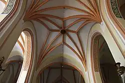 Jest to późnogotycka budowla, halowa, trójnawowa, 6-przęsłowa, z trójbocznymi zamknięciami naw od wschodu. Nawa główna jest szersza od bocznych i bardziej wysunięta ku przodowi. W północnej części znajduje się trójprzęsłowa zakrystia oraz trzy kaplice. Od strony zachodniej znajduje się kwadratowa wieża, z okrągłymi podporami. Od południa wybudowano cztery kaplice oraz niewielką neogotycką kruchtę. Wymiary wewnętrzne świątyni: