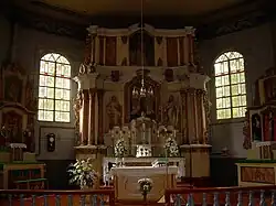 Wyposażenie wnętrza barokowe, z zespołem bogato zdobionych ołtarzy, rokokową chrzcielnicą oraz amboną.