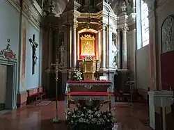 W ołtarzu głównym mieści się w rokokowej ramie obraz Matki Bożej z Dzieciątkiem z połowy XVII wieku. Po bokach mieszczą się wykonane w połowie XVI wieku rzeźby świętych Piotra i Pawła. W kościele znajdują się: barokowy chór, późnobarokowe ołtarze, rokokowa chrzcielnica oraz ambona (ozdobiona herbami Pobóg i Ślepowron). Na uwagę zasługuje również obraz „Święta rodzina” z 1830 roku. W skarbczyku nad zakrystią mieści się pochodzący z klasztoru w Lądzie zbiór rzeźbionych w drewnie popiersi świętych z połowy XVII wieku.
