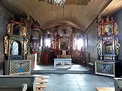 Większość wyposażenia kościoła jest drewniana i wykonana w stylu barokowym.