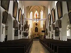 Obecnie jest to świątynia orientowana, murowana, wybudowana z cegły, rozplanowano ją na rzucie prostokąta, z wydzielonym prezbiterium zakończonym poligonalnie. Trzyprzęsłowe prezbiterium jest nakryte sklepieniem sieciowym, natomiast trzynawowy sześcioprzęsłowy korpus o układzie bazylikowym w nawie głównej nakryty jest sklepieniem kolebkowym, a w nawach bocznych nakryty jest sklepieniem krzyżowym. Jego zewnętrzne mury są pamiątką po świątyni późnoromańskiej wzniesionej na przełomie XII i XIII wieku. Była to bazylika ceglana o trzech nawach, zamknięta od strony wschodniej trzema absydami, i nakryta drewnianym stropem. Wyposażenie wnętrza reprezentuje się bardzo skromnie, składają się na nie rzeźbione w drewnie trzy ołtarze w stylu barokowym z początków XVIII wieku, ambona z 1677 roku, i znajdujące się w zakrystii szafy w stylu późnogotyckim, w tym jedna z 1513 roku[3].