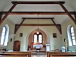 Z pierwotnego wyposażenia zachowały się: empora chóru muzycznego, posadzka, stolarka drzwiowa i więźba dachowa (częściowo)[7].