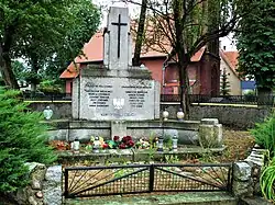 Przy kościele postawiono w 1946[8][1] (lub 1945[6]) pomnik ku czci ofiar zbrodni niemieckich z okresu II wojny światowej. Na tablicy umieszczono nazwiska dwunastu ludzi. U stóp monumentu znajdują się mogiły osób pomordowanych przez Niemców w bliżej nieustalonych okolicznościach[1].
