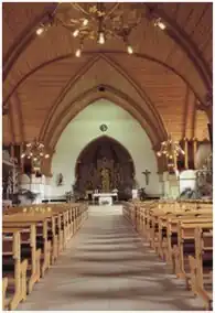 Obiekt mieszczący około 1500 wiernych ma długość 47 metrów i harmonijnie spaja budulec kamienny z drewnianym. Wieża ma wysokość 37,8 metra. Zawiera cztery dzwony sprowadzone przez księdza Štefana Kubičára. Sklepienia są drewniane, a poszczególne żebra wsparte są na trawertynowych kapitelach kolumn z wyrytymi krzyżami. Ołtarze przeniesiono z poprzedniego, drewnianego kościoła. Wykonano je w Tyrolu w początku XX wieku. Droga krzyżowa została zakupiona przez parafian w 1905, a organy w latach 30. XX wieku staraniem księdza Aurela Mihaliaka. Żyrandole (trzy sztuki) pochodzą z 70. XX wieku. Wyrzeźbił je lokalny artysta, Rudolf Svinčák[1].