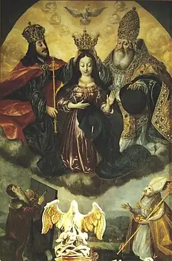 Wewnątrz świątyni znajdują się drewniane stropy pokryte polichromią – w prezbiterium z około 1640 roku ze sceną Wniebowzięcia Najświętszej Maryi Panny – zapewne dzieło Bartłomieja Strobla, nadwornego malarza Władysława IV Wazy. W nawie znajduje się polichromia stropu sprzed 1680. Wyposażenie wnętrza barokowe, rokokowe i klasycystyczne z czasów od końca XVII do początku XIX stulecia. Należy także zwrócić uwagę na wysokiej klasy obraz przedstawiający Koronację Marii, namalowany przez Strobla w 1643 roku. W kościele mieści się pomnik Jana Długosza (1415–80) – historyka i kronikarza[3].