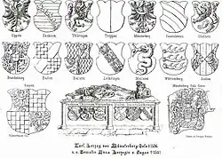 - po lewej stronie: Mesisen (Marchii Miśnieńskiej); Bayern (Bawarii), Meiland (Księstwa Mediolanu)[8]; Luthringen (Lotaryngii)[9]; Wirtemberg (Wirtembergii); Baden (Badenii)[10]