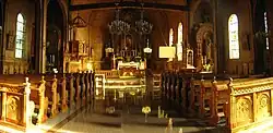 Ołtarz główny z obrazem św. Anny, po jego bokach drewniane rzeźby św. Jana Ewangelisty i św. Jakuba Starszego, w górnej części ołtarza obraz przedstawiający św Trójcę.