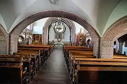 Wnętrze posiada okrągłe klatki schodowe, prowadzące do empor bocznych oraz osobną klatkę wiodącą na wieżę[2].