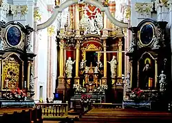 Oprócz tego kościół posiada dwa barokowe ołtarze boczne i chrzcielnicę z XVIII stulecia. Fasady: frontową i wschodnią zwieńczają wolutowe szczyty. Nawa i prezbiterium są nakryte dachami dwuspadowymi, zakrystia i składzik – pulpitowymi[2].