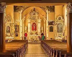 Wystrój wnętrza świątyni to mieszkanka stylów: późnorenesansowego, barokowego i rokokowo-klasycystycznego, z okresu od XVII stulecia do początku XIX stulecia. Ołtarz główny reprezentuje styl rokokowo-klasycystyczny z przełomu XVIII/XIX stulecia, lekko wklęsły, z bramkami, nad którymi mieszczą się rzeźby św. Heleny i św. Jana Ewangelisty; w zakończeniu znajduje się rzeźbiona grupa Najświętszej Maryi Panny i św. Jana adorujących serce gorejące oraz rzeźba św. Jerzego, prawdopodobnie z XVII stulecia. Lewy ołtarz boczny znajduje się przy tęczy i reprezentuje styl późnorenesansowy, został wykonany w 1637 roku, przekształcony w XVIII/XIX stuleciu poprzez dodanie kręconych kolumn i zakończenia; w nim mieści się obraz współczesny Najświętszej Maryi Panny z Dzieciątkiem, w sukience drewnianej, z XVIII stulecia, poza tym dwie rzeźby nierozpoznanych świętych z XVIII stulecia, mensa w stylu rokokowym. Prawy ołtarz boczny znajduje się przy tęczy i reprezentuje styl późnorenesansowy z 1637 roku, z zakończeniem z przełomu XVIII/XIX stulecia, w predelli znajduje się malowane, współczesne przedstawienie Jezusa w grobie; w zakończeniu mieści się obraz niezidentyfikowanego świętego, w stylu barokowym z XVII/XVIII stulecia, w kształcie owalu, mensa reprezentuje styl rokokowy. Ołtarz przy elewacji północnej posiada obraz z podobizną Jezusa Ukrzyżowanego, pierwotnie był on prawdopodobnie tłem rzeźbionego krucyfiksu, w stylu barokowym z XVII stulecia, restaurowany w 1821 roku[3].