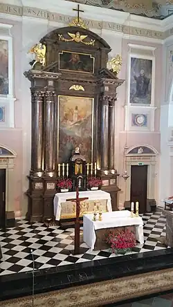 Na uwagę w kościele zasługuje marmurowy ołtarz główny, który został tu przeniesiony w 1856 ze zlikwidowanego kościoła św. Wojciecha. Od początku XVII w. istnieje przy świątyni wolnostojąca dzwonnica.