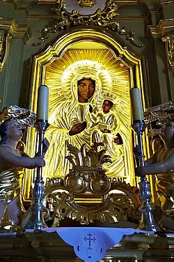 Wnętrze nakryte jest płaskimi stropami z zaskrzynieniami. Późnogotyckie portale wejściowe do nawy od południa i do zakrystii wycięte są w tzw. ośli grzbiet. Wnętrze pomalowane jest młodopolską polichromią. Na ścianach wymalowane są figury nawiązujące do Starego Testamentu, a na stropie przedstawiają sceną koronowania Matki Bożej w otoczeniu polskich świętych oraz umierającego powstańca od którego odlatuje orzeł dzierżący miecz, co jest alegorią Polski. Znajdujący się pomiędzy nawą a prezbiterium łuk tęczy jest półkolisty, wyprofilowany i nadwieszony na kroksztynach. Ołtarz główny z obrazem Matki Bożej z Dzieciątkiem, dwa boczne ołtarze oraz ambona są rokokowe, z końca XVIII wieku. Rokokowy jest również prospekt organowy z XVIII wieku, zaś chrzcielnica jest klasycystyczna. W przyziemiu wieży znajdują się liczne feretrony, m.in. przedstawiający Matkę Bożą ze scenami z żywota jej i Chrystusa. Obok nich wisi obraz Koronacji Matki Bożej.