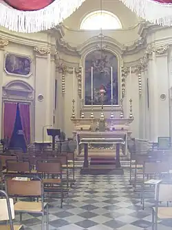 Kościół wewnątrz ozdobiony jest w podobnym stylu, jak na fasadzie. Kapitele jońskich pilastrów również zawierają festony i kwiaty. Ciężki gzyms obiega całe wnętrze. Między czterema dużymi łukami widać cztery lunety, doświetlające wnętrze, zaś całość wznosi się do góry, utrzymując kopułę z latarnią[1][5].