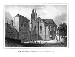 Romańska część kościoła została wyświęcona w 1042 roku. W 1168 roku został dobudowany północny portal głównej hali kościoła. W 1250 roku obydwie wschodnie wieże zostały podniesione o dwa piętra. W 1490 roku do romańskiej bazyliki został dobudowany późnogotycki chór, a wschodni został poszerzony. Aby udostępnić przejście do ulicy Uferstrasse zostały dobudowane arkady. W latach 1663–1667 w wyniku rozbudowy fortyfikacji Twierdzy Marienberg zachodnia wieża, oraz dwa łuki z głównej hali kościoła zostały wyburzone. Do 1464 roku klasztor należał do Benedyktynów. W latach 1464–1803 klasztor należał do fundacji kanoników (Kollegiatstift). W wyniku sekularyzacji i likwidacji fundacji, majątek został przekazany parafii w 1803 r.