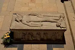 Usytuowany na skrzyżowaniu naw grobowiec margrabiego jest późniejszy, powstały w 1519 na miejscu wcześniejszego. Wówczas, kiedy już w Niemczech rozpowszechniła się sztuka renesansowa, dzieło to kontynuuje tradycję typowego dla XIV i XV-wiecznej rzeźby sepulkralnej gotyckiego nagrobka tumbowego. Na płycie wierzchniej widoczna jest płaskorzeźbiona figura zmarłego w pozie leżącej. Ukazany jest jako uzbrojony rycerz, u jego stóp jest znajduje się pokonany lew, który trzyma w pysku tarczę z herbem rodowym zmarłego – przedstawia dwa wspięte lwy zwrócone tyłem do siebie. Margrabia trzyma w prawej ręce miecz, w lewej włócznię, która jest wbita w zad lwa. Jest to powszechny w sztuce sepulkralnej doby gotyku przykład wyobrażenia władcy triumfatora. Na bocznych ścianach zachowały się również przedstawienia figuralne, wśród nich wyróżnia się znajdujące się na zachodnim boku płaskorzeźbione wyobrażenie świętych Cyriaka oraz Benona, pomiędzy nimi jest ukazana bestia, atrybut św. Cyriaka.
